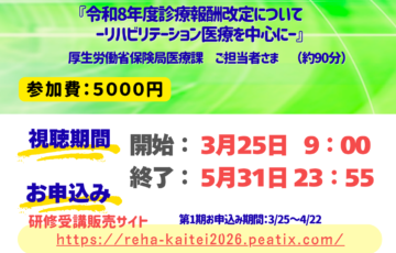 福岡県令和8年度 診療報酬改定研修会 第2弾「令和8年度診療報酬改定について ーリハビリテーション医療を中心にー」の開催のお知らせ 2026.03.19
