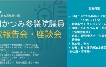 また本総会において、理学療法士 小川かつみ 参議院議員が幹事長に就任されましたこともご報告させていただきます。