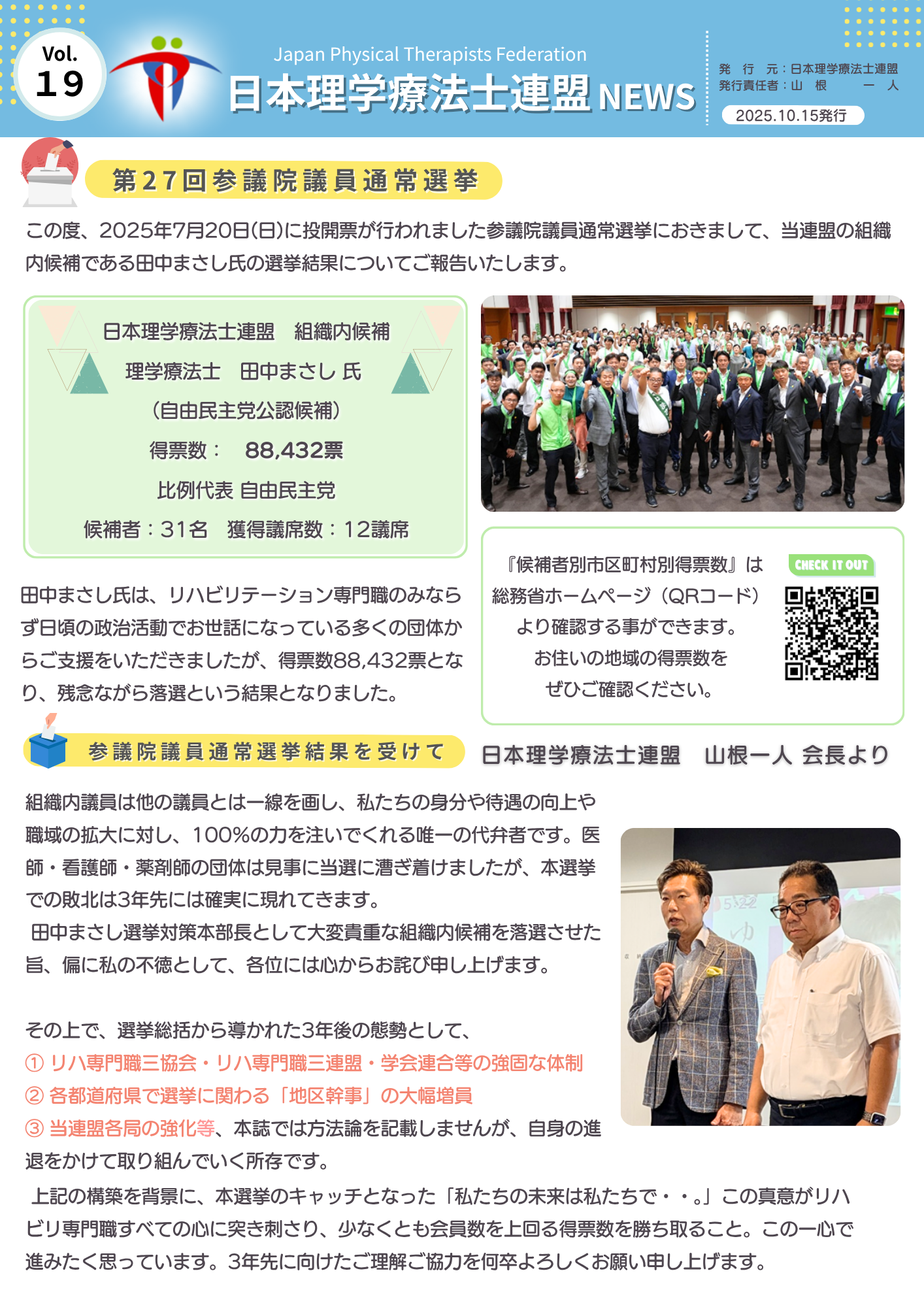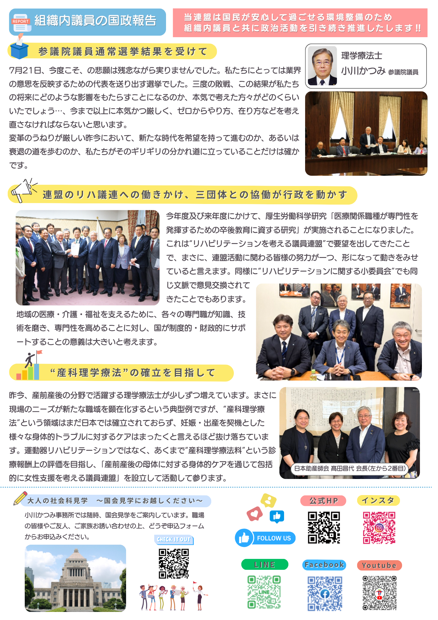 2025.10.15 2025.11.06 お知らせkouhou 連盟ニュースNo19 ~第27回参議院議員選挙報告と小川かつみ参議院議員国政報告~ 第27回参議員議員通常選挙を終えて 今回の号では、当連盟が推薦する組織内候補である 理学療法士 田中まさし氏が立候補した第27回参議院議員通常選挙の結果、そして山根一人会長からの選挙の総括と今後の活動に向けた想いを掲載、そして組織内議員である理学療法士 小川かつみ参議院議員からの国政報告を紹介しています。ぜひご覧ください。