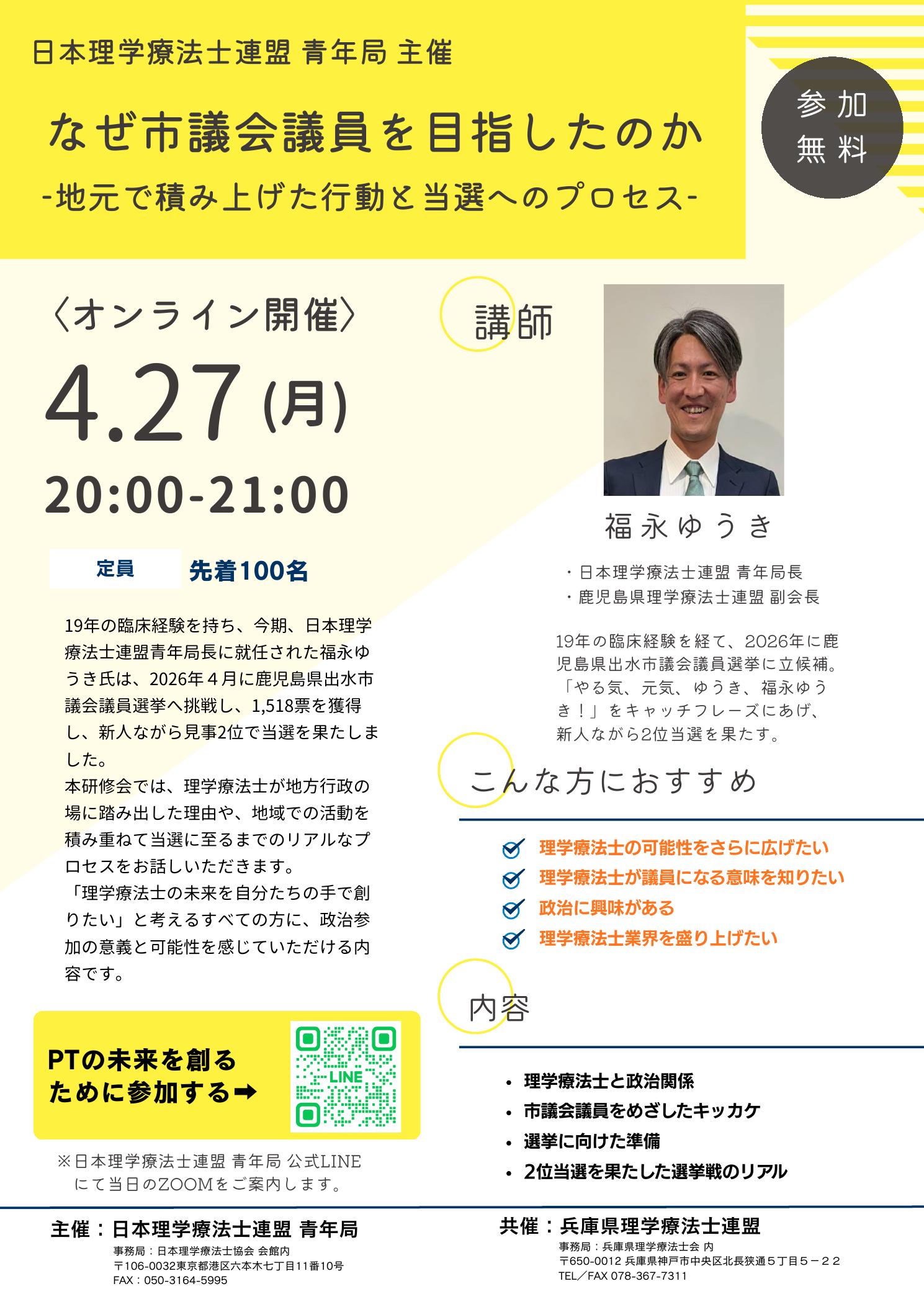 本研修では、理学療法士としての経験を基盤に地域活動へと踏み出し、実際に市議会議員として当選を果たした福永ゆうき氏を講師にお迎えします。