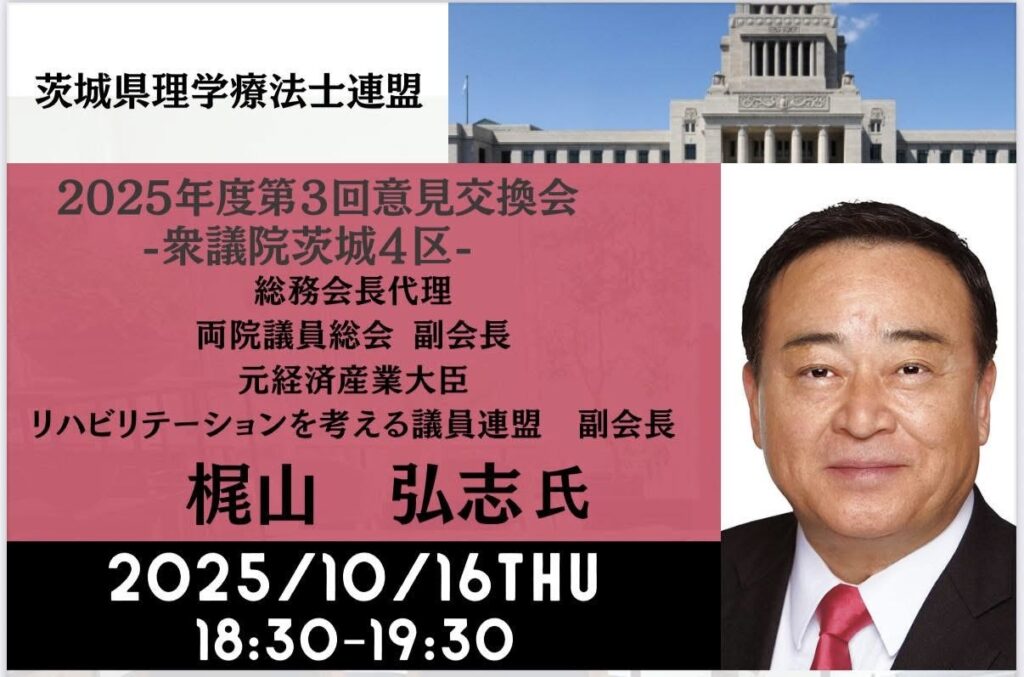 第3回茨城県理学療法士連盟意見交換会 茨城4区選出、衆議院議員でありリハビリテーションを考える議員連盟副会長である梶山弘志氏との意見交換会を行います。 現場の声を聞き、国政に活かす 貴重な経験ですので…