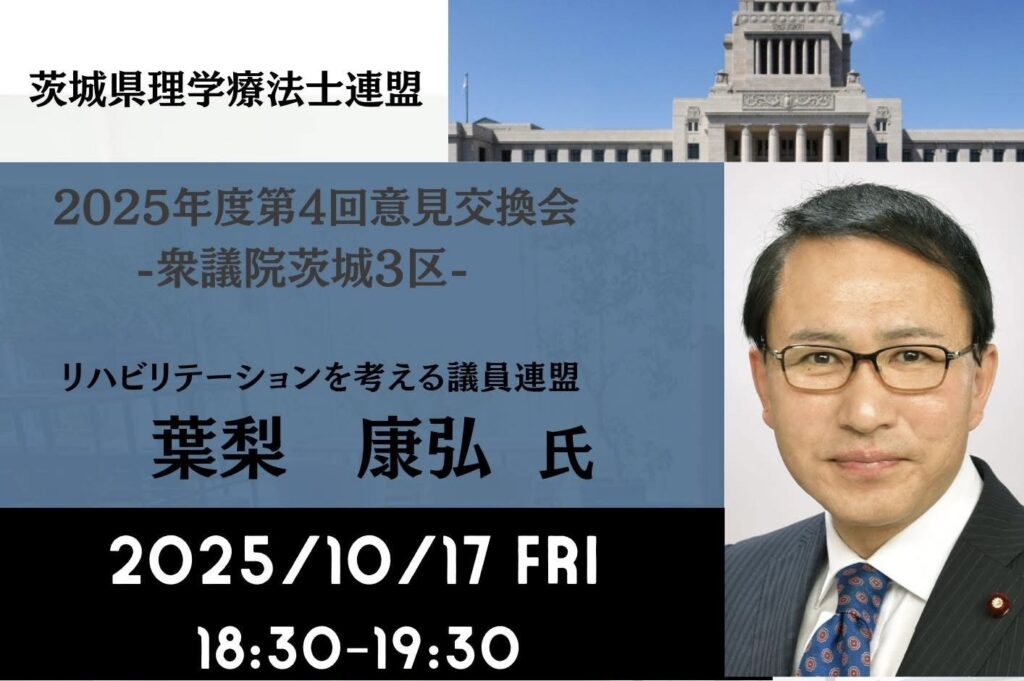 第4回茨城県理学療法士連盟意見交換会 茨城3区選出、リハビリテーションを考える議員連盟に所属しております衆議院議員の葉梨康弘氏との意見交換会を行います。 地元のために活躍されている葉梨氏であります。貴…