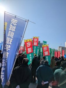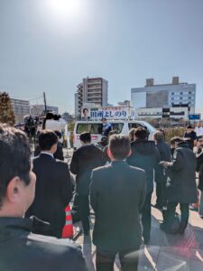 1区の田所よしのり候補者の出発式に参加しました。平日であるが多くの方が集まり、また関係団体ものぼりを持って熱き声援を送っています。