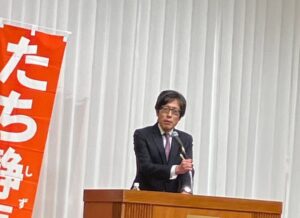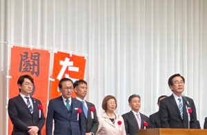 数多くの来賓や発起人などが集まり、のぼりにもある闘う県議という思いが伝わる熱い会場でした