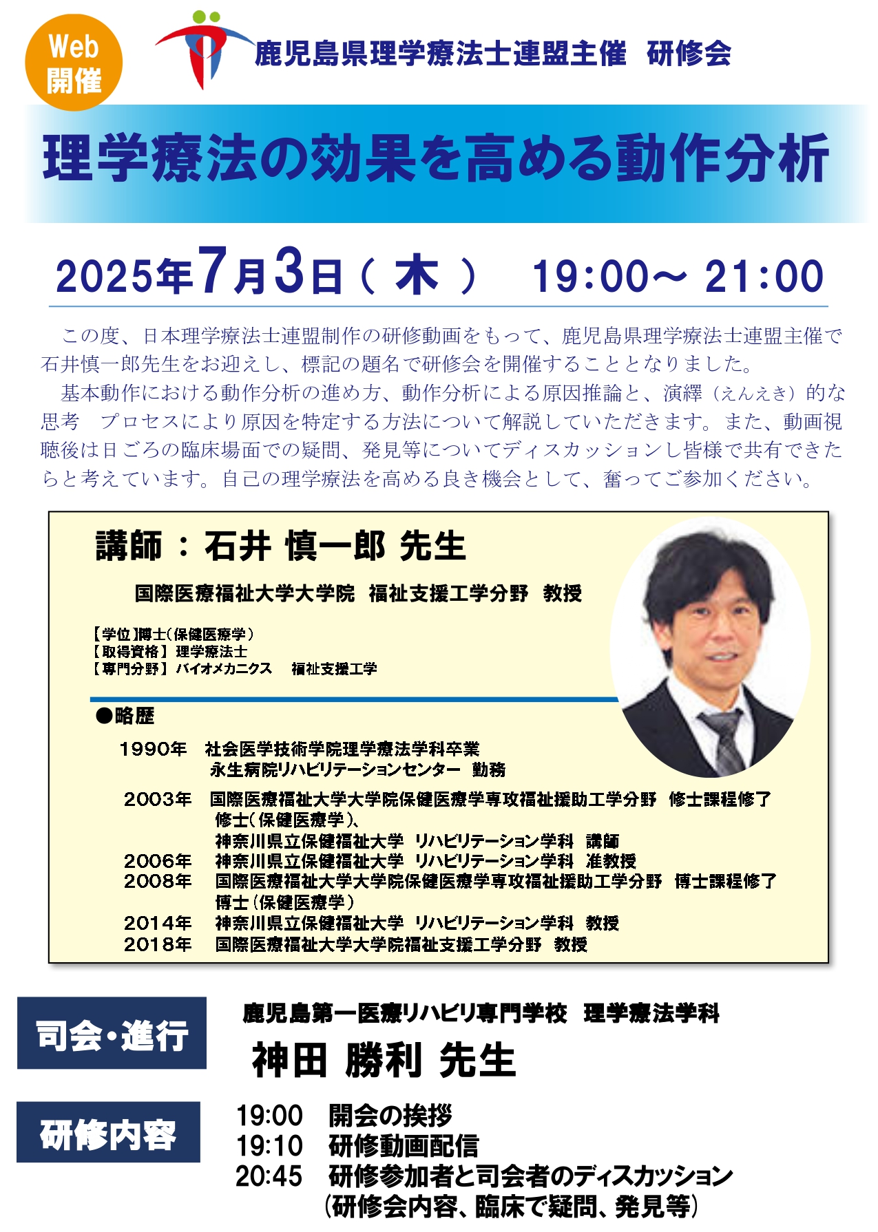 今回、日本理学療法士連盟制作の研修会動画をもって、鹿児島県理学療法士連盟主催にてweb研修会を開催いたします。なにかと難しい動作分析。基本動作における動作分析の進め方や原因推論等、一緒に学んでみませんか?