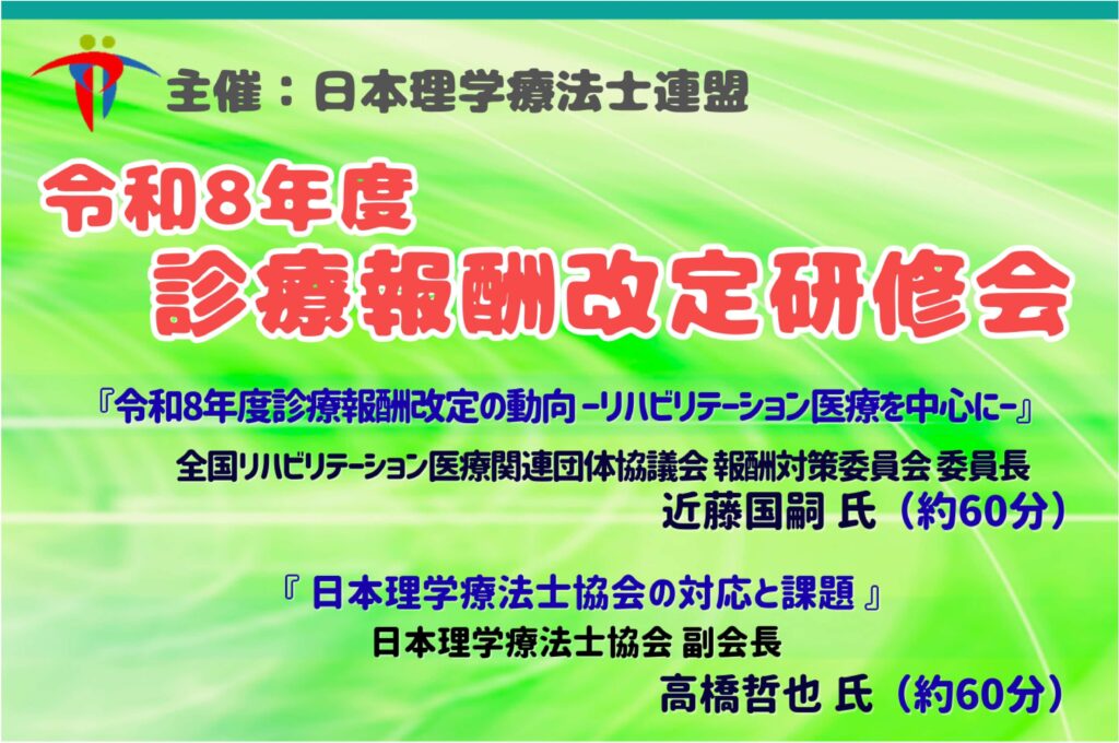 お知らせ 研修会 第2弾のご案内 第1弾では(2026年度)診療報酬改定について、どのような方向で行われるか、また日本理学療法士協会の方針について解説いただき、それに続けて第2弾は 令和8年度(2026年度)診…