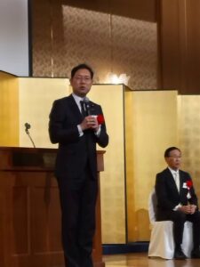 ANAクラウンプラザホテル京都にて開催され、参加しました。当日は250名ほどの参加者のもと盛大に行われ、後援会長の挨拶のあと、西脇隆俊京都府知事、松井孝治京都市長、伊吹文明元衆議院議員、吉井章参議院議員(遅れて参加)の来賓挨拶、来賓紹介、本人挨拶があり、乾杯は勝目康衆議院議員が高らかに乾杯の杯を上げられました。