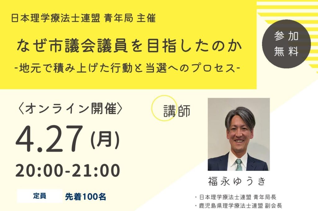 お知らせ 日本理学療法士連盟は理学療法士 福永裕樹氏に推薦状を発出いたしました。 福永裕樹氏は新人として立候補、また日本理学療法士連盟 青年局長を務められております。 皆さま ご支援の程よろしくお願いいたします…