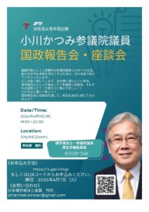 この度、日本理学療法士連盟(女性局・青年局)の企画により、小川かつみ参議院議員を招聘し「国政報告会・座談会」が開催される運びとなりました。